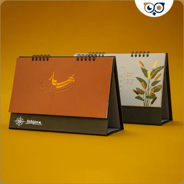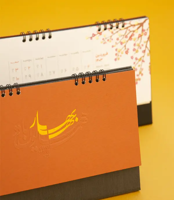 طراحی و تولید پکیج کامل هدایای نوروزی شامل تقویم رومیزی، سررسید با ۸ صفحه لت اختصاصی، ساک دستی و کارت تبریک